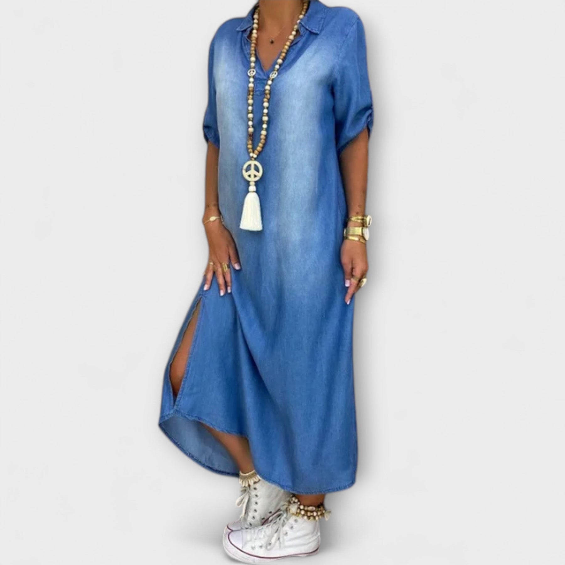 Præsenterer Lea Lang Denim-Look Kjolen, dit ideelle outfit til enhver lejlighed. Fremstillet af blødt, åndbart denim, forener denne kjole ubesværet stil og komfort. Dens let vaskede udseende giver et strejf af afslappet elegance, hvilket gør den perfekt til hektiske dage eller afslappede weekender.